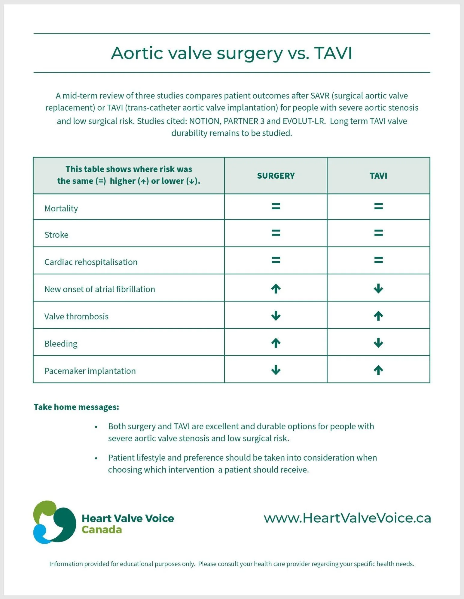 In conclusion, both surgery and TAVI are excellent and durable options for people with severe aortic valve stenosis and low surgical risk. The patient should have an important voice and weight in the decision between surgery versus TAVI and should feel comfortable asking questions and expressing their preferences depending on their lifestyle and aspirations following aortic valve replacement.